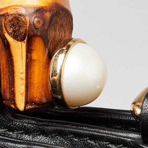 The exterior leather is clean with some light creasing and light scuffs throughout. The bamboo top handle is clean and the canvas shoulder strap is clean with some light creasing. The upper trim along the opening has some indentations from the handle. The goldtone hardware is bright and crisp. The interior lining is clean with some light rubbing to the lining and to the leather trim throughout.
