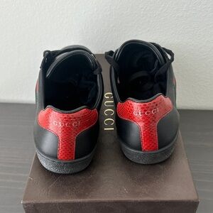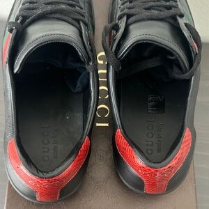 Sleek black sneakers with signature red and green stripes. Stylish and versatile for any casual look.