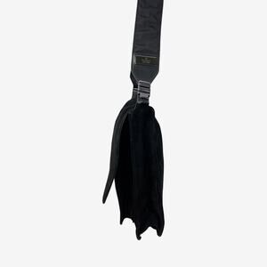 Authentic vintage Gucci black suede shoulder bag, style 001 3266 001998. Features a structured flap front, wide nylon shoulder strap with a comfortable 17” drop, smooth leather interior flap, and Gucci-logo textile lining. Spacious main compartment with zip pocket and magnetic closure. Minimalist, gender-neutral design ideal for daily carry, work, or travel. Clean interior with light vintage wear to suede.