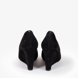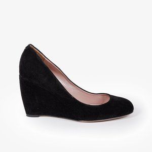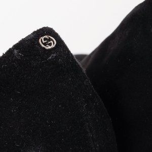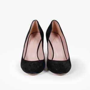 A pair of wedge heels from Gucci crafted from smooth suede in black with a rounded toe, dark mauve leather lining and insoles with the brand name in gold lettering.