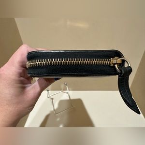 This Gucci Sylvie Continental Wallet Leather, crafted from black leather, features a nylon web detail with buckle and gold-tone hardware. It opens to a black leather interior with multiple card slots and center zip Condition: Very Good. Minor wear on flap trim, faint scuffs on Sherry Line some feather scratches on exterior and underneath flap, scratches on hardware.