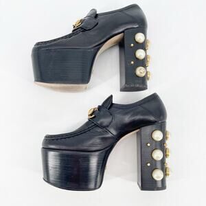 Gucci Black Vegas Horsebit Pearl Studded Platform Loafer Block Heel Pump EU 36.5