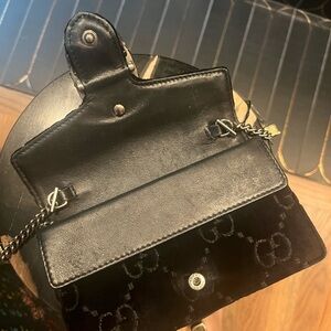 Luxurious black velvet clutch. Features elegant chain detail. Iconic Gucci design. Comes with key chain on bag and COA. Offers welcome.