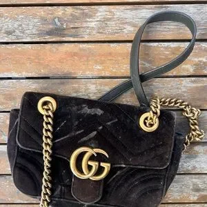 This elegant black velvet shoulder bag features a luxurious gold chain strap and iconic GG logo. Perfect for adding a touch of sophistication to any outfit. Note: (visible signs of wear on exterior), see photos and signs of wear in interior. Nothing a good cobbler can’t fix