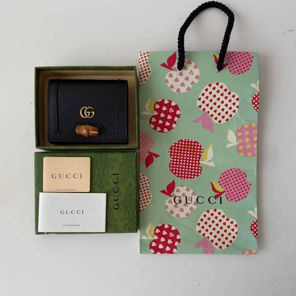 Chic Gucci wallet in black with a gold logo. Includes a vibrant gift bag.