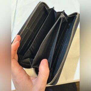 Elegant black Gucci wallet with embossed logo. Features iconic red and green stripe detail.