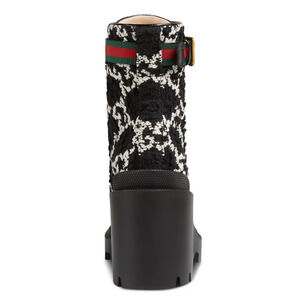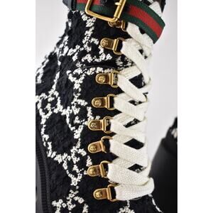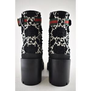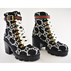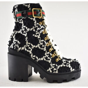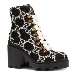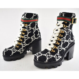Gucci Black White GG Logo Tweed Lace Up Tie Block Heel Lug Sole Combat Boot 36.5
