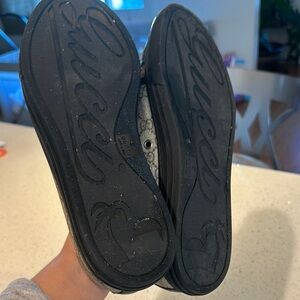 Stylish Gucci men's shoes. Black leather with beige monogram design. Comfortable and trendy.