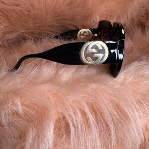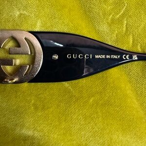 These Gucci sunglasses feature a bold, oversized design with glossy. Crafted for a fashion-forward look, they offer a perfect blend of style and sophistication. Ideal for making a statement, these sunglasses are a must-have accessory for any fashion enthusiast.