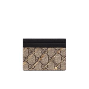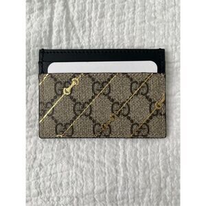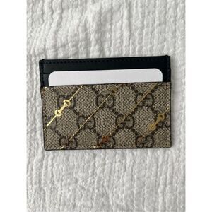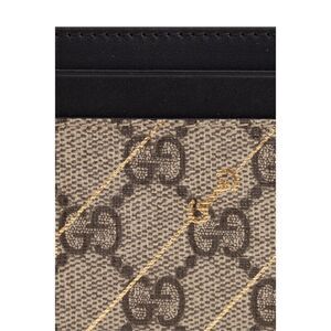 Elegant Gucci card holder. Features iconic GG pattern. Black and gold design.