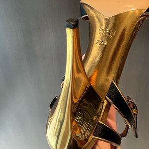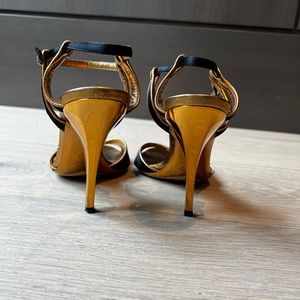 Elegant Gucci heels in black and gold. Features stylish embellishments. Perfect for a night out.