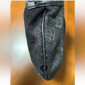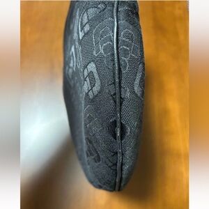 Elegant Gucci shoulder bag. Features black fabric with subtle pattern. Gold hardware accent.