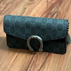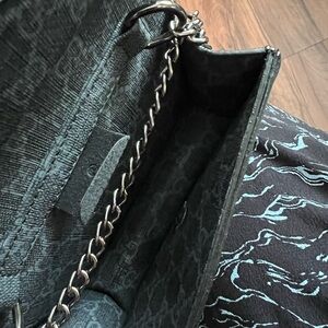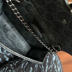 Elegant Gucci bag with silver chain. Iconic logo pattern. Sleek design.