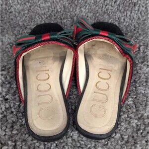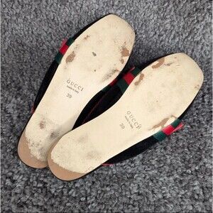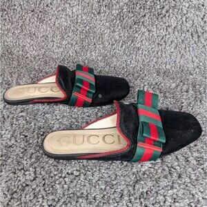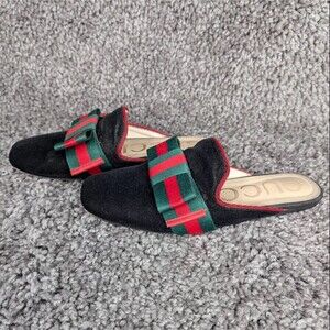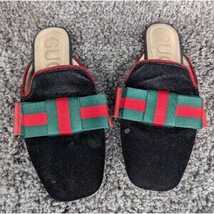 Stylish Gucci flats. Black base with green and red accents. Comfortable and chic design.