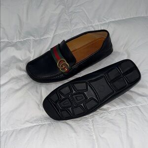 Experience luxury with these Gucci loafers, crafted from premium black leather and adorned with iconic green accents. The slip-on design ensures ease and comfort, while the classic Gucci branding adds a touch of elegance. Perfect for both formal and casual settings, these loafers are a timeless addition to any wardrobe.