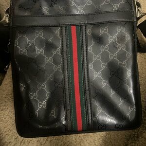 This Gucci messenger bag is a stylish blend of black and green, featuring the brand's signature red and green stripe. Crafted from a mix of canvas and leather, it offers a structured design that combines elegance with durability. Ideal for those who value luxury and practicality in their accessories. Peeling some areas