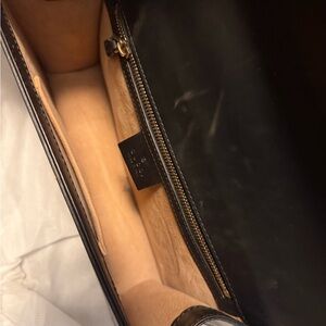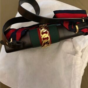 Chic Gucci shoulder bag with iconic gold chain detail. Features elegant black leather and green accents. Stylish red and blue ribbon adds flair.
