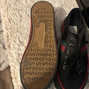 Stylish Gucci sneakers in black with green and red stripes. Perfect for casual wear.