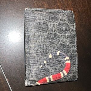 This Gucci key and card holder showcases a bold snake design in vibrant red and white stripes against a dark gray monogram background. Crafted from a textured canvas-like material, it combines style and functionality, making it a standout accessory.