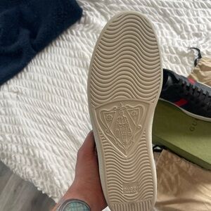 Step out in style with these Gucci sneakers, featuring a striking black and red color scheme. The textured fabric upper adds a touch of sophistication, while the contrasting white sole ensures a modern look. Perfect for casual outings, these sneakers combine comfort and fashion effortlessly.