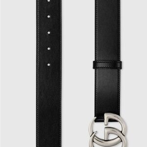 This luxurious Gucci belt showcases a sleek black leather design paired with a striking silver-toned double G buckle. The smooth leather and iconic hardware create a timeless accessory that adds elegance to any outfit.