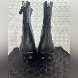 Elevate your wardrobe with these sophisticated Gucci ankle boots, crafted from supple black leather with a pointed toe and slender stiletto heel. Featuring a back zip for easy wear and a glove-like fit, these boots strike the perfect balance between bold and timeless. Includes original Gucci box and dust bag for a complete designer experience.