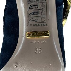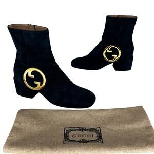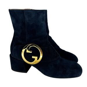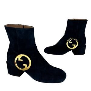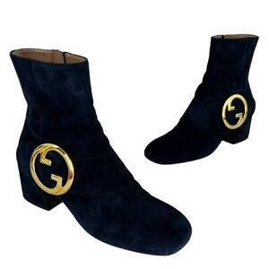 These iconic Gucci Blondie booties feature luxurious blue suede in a sleek, structured silhouette. The square toe and 2.25" wrapped block heel add both retro charm and everyday wearability. A functional side zipper provides easy on-off access, while the signature gold logo hardware and ankle strap lend bold designer appeal. Finished with leather lining and sole, these Italian-made booties are a standout wardrobe staple that elevates any outfit.