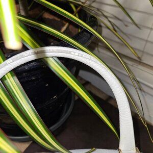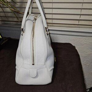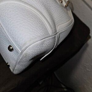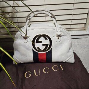 Gucci Large Blondie Bowler in white pebbled leather with Gucci's webbing and large brass iconic GG emblem running in the center. Really good condition but does have rubbing on corners and handles and various rubbing throughout (please see all photos). It probably could use a good leather cleaning. Interior is in great shape in black fabric. It is a large bag measuring approximately 16" Length x 14" Height x 5" Depth. Please feel free to contact me with any questions or if you require additional photos. Bag was purchased by me from a Gucci boutique in San Francisco and I believe it retailed for $1100 then (over 20+ years ago). It is a definite favorite and classic bag, never going out of style.
