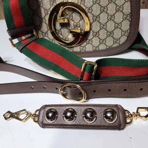 This Gucci Blondie is so cool! It has three different gucci straps. canvas green and red for a sporty look, great for crossbody, then the studded short jackie style handle is great for a handbag look or carry like a clutch. then have a elegant shoulder strap for that classy GG look. The bag features a medium size and is made of canvas coated with a beautiful brown exterior color. The bag comes with a detachable strap, allowing it to be worn as a shoulder bag or as a crossbody. The bag also comes with a dust bag. The hardware color is gold, and the lining color is beige. This bag is part of the Gucci Blondie product line and is perfect for any occasion. Excellent condition