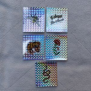 Set of 5 stickers from the Gucci Bloom fragrance launch. Features 5 different Gucci designs, including a snake, beetle, rose, and tiger. Holographic foil background.