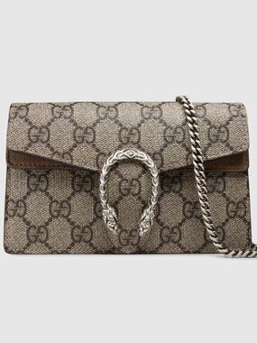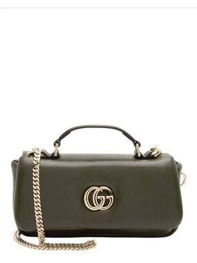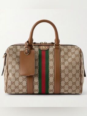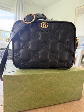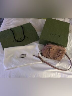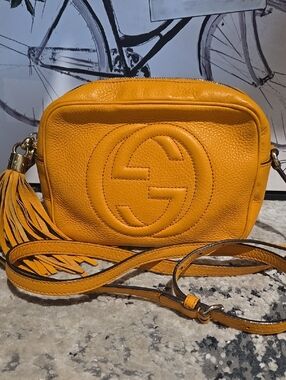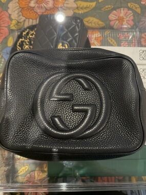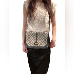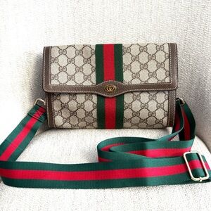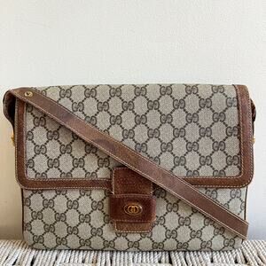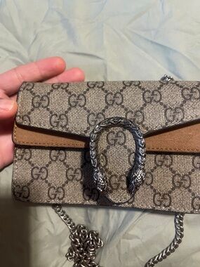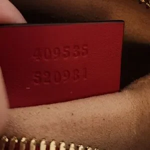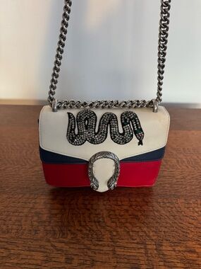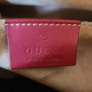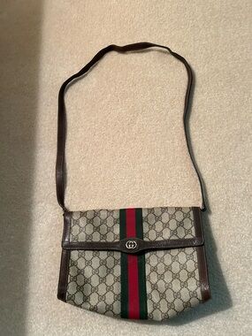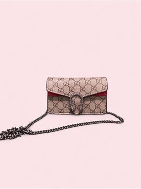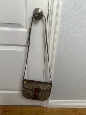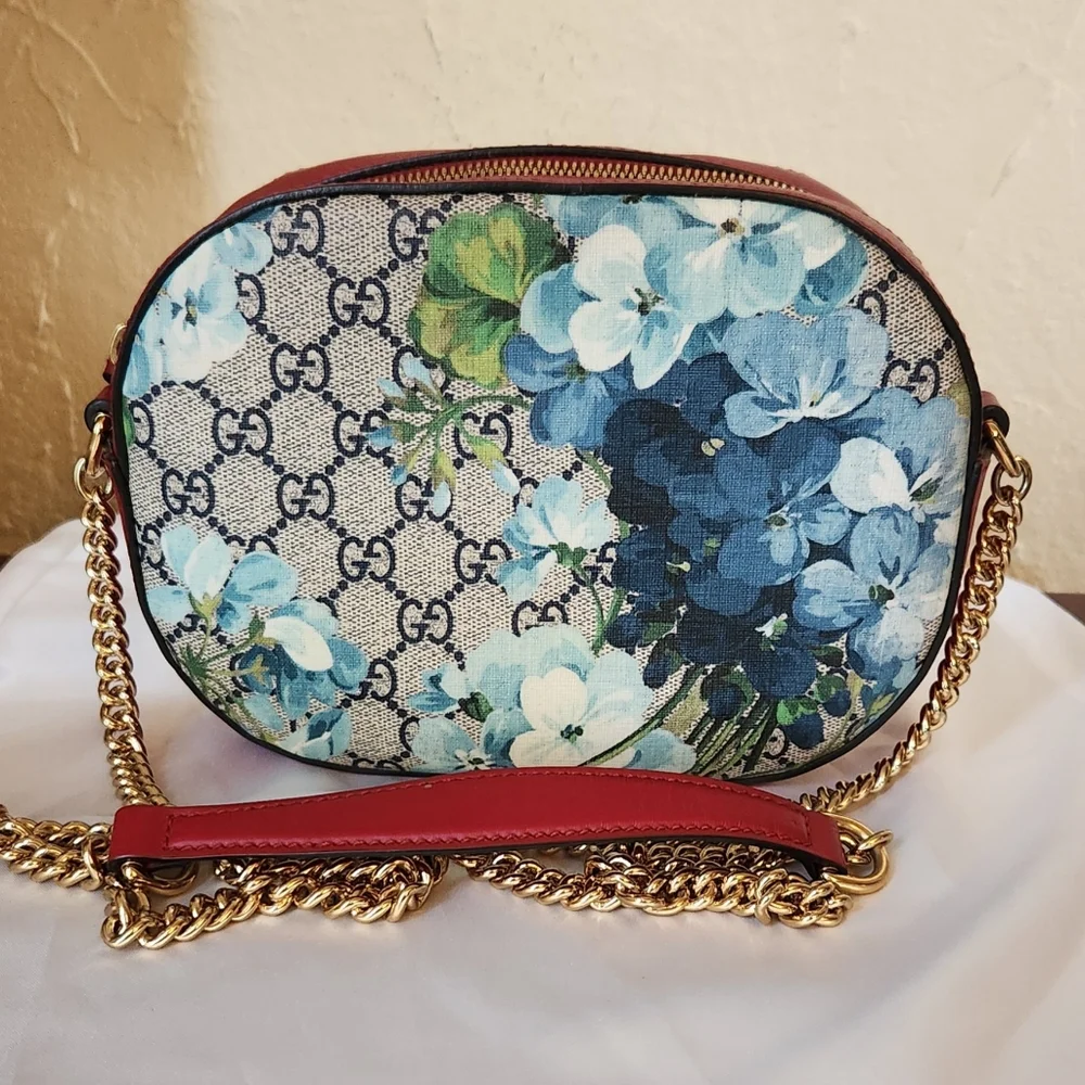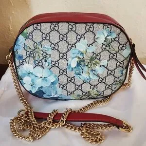 Authentic Gucci Blooms Crossbody bag is crafted of coated canvas and red leather trim and features a gold chain crossbody strap with a floral motif. The bag opens to a beige suede interior with a flat pocket. Measures approx. 8"x2"x6" with a 22" strap drop. Item is in gently used, pre-owned condition with minimal signs of wear on exterior and some stains on the interior (see photos). Includes dust bag.