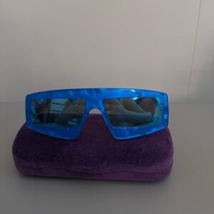 Stylish blue glasses with iconic gold Gucci emblem. Perfect for a modern look.