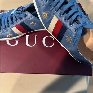 Stylish Gucci blue sneakers featuring gold star and bee embroidery. Accented with red, white, and blue stripes.