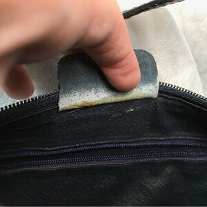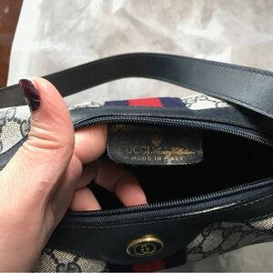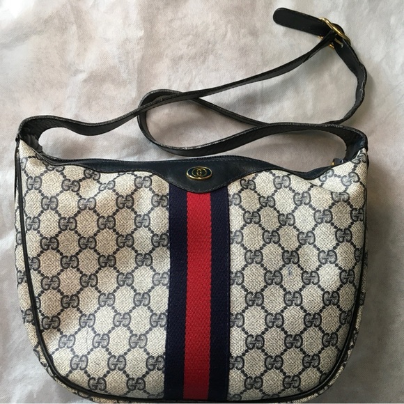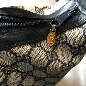 Vintage blue Gucci, code behind leather logo has faded out. Gold hardware, some tarnish wish age. Light rubbings on corners. Color transfer on the canvas. Zipper works well, no powdery or peeling leather inside. Great medium size bag. Keeps it shape but has a little bit of flexibility when you fill the bag. Strap is dented or has impressions on leather from keeping it in the buckle for previous user. Some rubbings on sides of strap from use.
