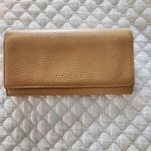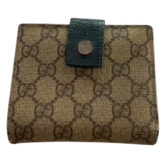This Gucci wallet showcases a striking geometric pattern in brown and blue, adding a modern touch to its classic design. Its compact size makes it ideal for daily use, while the snap closure ensures your essentials are secure. Crafted with precision, this wallet is a stylish addition to any collection.