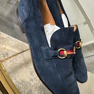 Experience luxury with these Gucci loafers, crafted in rich blue suede and adorned with a signature gold horsebit detail. The slip-on design and moccasin-like construction offer a blend of elegance and comfort, making them ideal for both formal and smart-casual occasions.