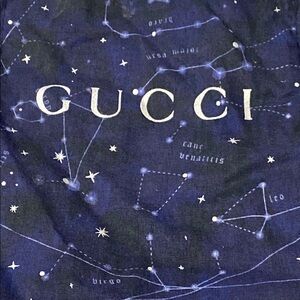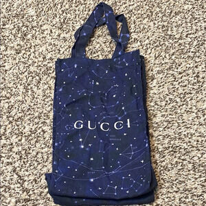 This casual Gucci tote bag features a captivating starry pattern in blue and white, making it a standout accessory. Crafted with a spacious design, it is perfect for carrying essentials in style. The iconic Gucci logo adds a touch of luxury to this versatile bag. Approximately 7”x4”x12”. VGUC. 2022, limited edition.