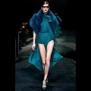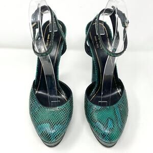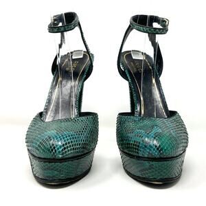 Elevate your look with these sultry and sculptural Gucci platform pumps from the Fall 2011 collection. Crafted in rich blue-green python with a glossy finish, these sky-high heels feature a rounded almond toe, stacked platform sole, and slim stiletto heel that commands attention. The delicate ankle strap adds balance and security, while the luxe black leather lining and gold-stamped insole echo the house’s timeless Italian craftsmanship.