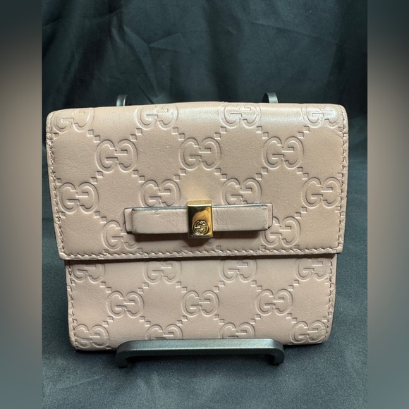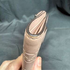 Preloved Chic Authentic Gucci wallet in blush leather. Features iconic embossed design. Compact and stylish.