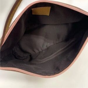 Chic Gucci shoulder bag in blush suede. Features a tan leather strap. Ideal for stylish outings.