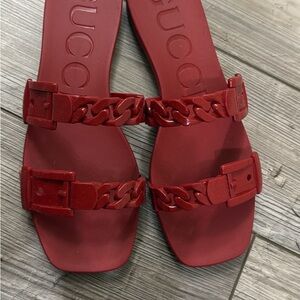Authentic Gucci rubber chain sandals in vibrant red. Features double strap with buckle and chain detail, embossed Gucci logo on the footbed.