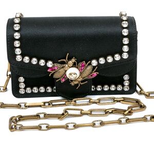A stunning limited edition Gucci Broadway mini shoulder bag, crafted in luxurious black satin and fully adorned with dazzling crystal embellishments. The centerpiece features Gucci’s signature antique gold-tone bee clasp, accented with ruby-red crystal wings and the iconic interlocking GG button.