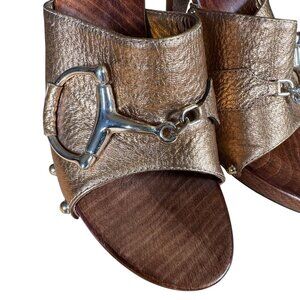 Gucci Bronze Leather Horsebit Wooden Clogs Heels Size 9B