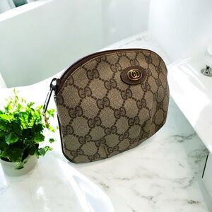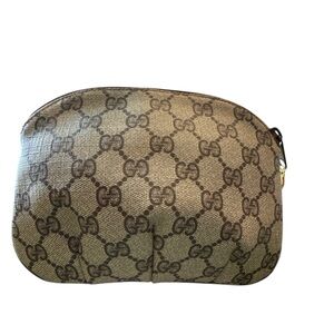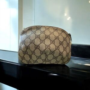 This Gucci cosmetic bag showcases a sophisticated brown monogram pattern, perfect for organizing your essentials in style. Crafted with high-quality materials, it features a dome-like shape and a gold-toned emblem, adding a touch of luxury to your travel accessories.