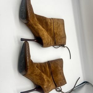 Elegant suede heeled boots. Rich brown color. Sleek design with pointed toe.