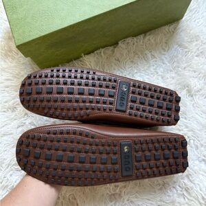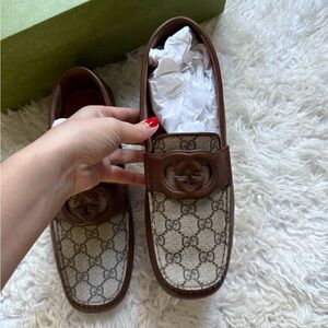 Get ready to step up your shoe game with the Gucci Brown Interlocking G Driver Loafers. These classic loafers feature a stylish design and premium quality construction, making them a wardrobe staple for any fashionista.