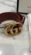 Elegant Gucci belt in brown leather. Features iconic gold GG buckle. Adds sophistication to any look. Comes with Gucci bag to store belt.