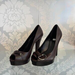 Dark brown high heels with a black leather interior lining and silver hardware detail on the front over peep-toe hole.