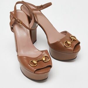 Step out in style with these Gucci brown leather platform sandals. Perfect for any occasion, these sandals offer both elegance and comfort.