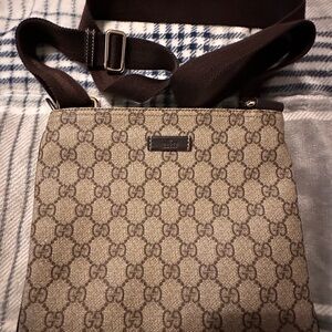 This pre owned Gucci messenger bag showcases the iconic GG monogram in a sophisticated brown hue, complemented by dark brown leather straps. Its sleek rectangular design and luxurious materials make it a perfect blend of style and practicality for everyday use.